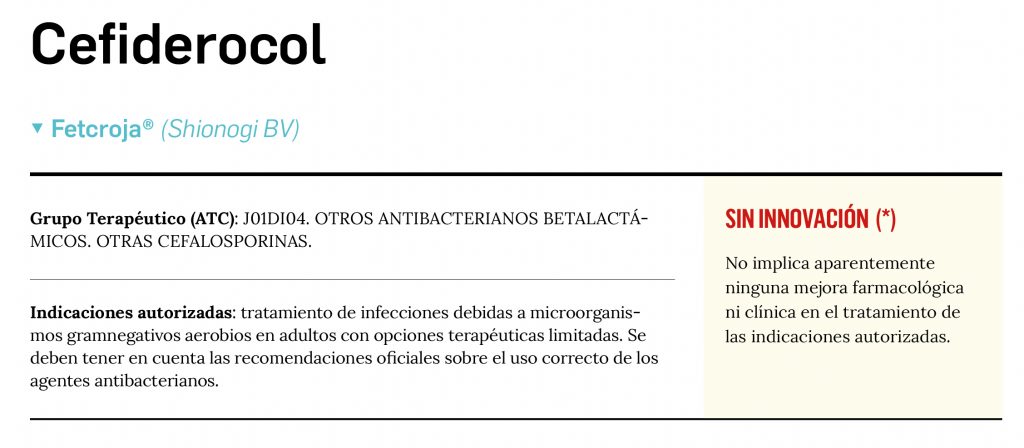 Por tanto, aunque se requiere de resultados más exhaustivos procedentes de la práctica clínica habitual, no parece que cefiderocol vaya a constituir una alternativa interesante en infecciones producidas por bacterias gramnegativas multirresistentes, más allá de los casos en que otros tratamientos para los que se disponga de mayor experiencia hayan fracasado (por resistencias) o estén desaconsejados (por intolerancia).