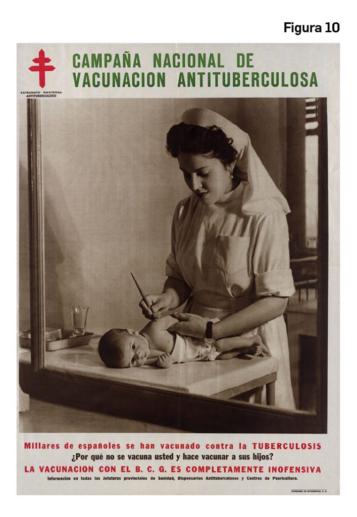 El primero de ellos (50×70 cm) es la fotografía, en blanco y negro, de una armónica enfermera en trance de vacunar a un bebé hermoso y tranquilo. Mediante la misma se contribuye a la Campaña nacional de vacunación antituberculosa y se hace mediante dos afirmaciones, una pregunta y una información (Figura 10).