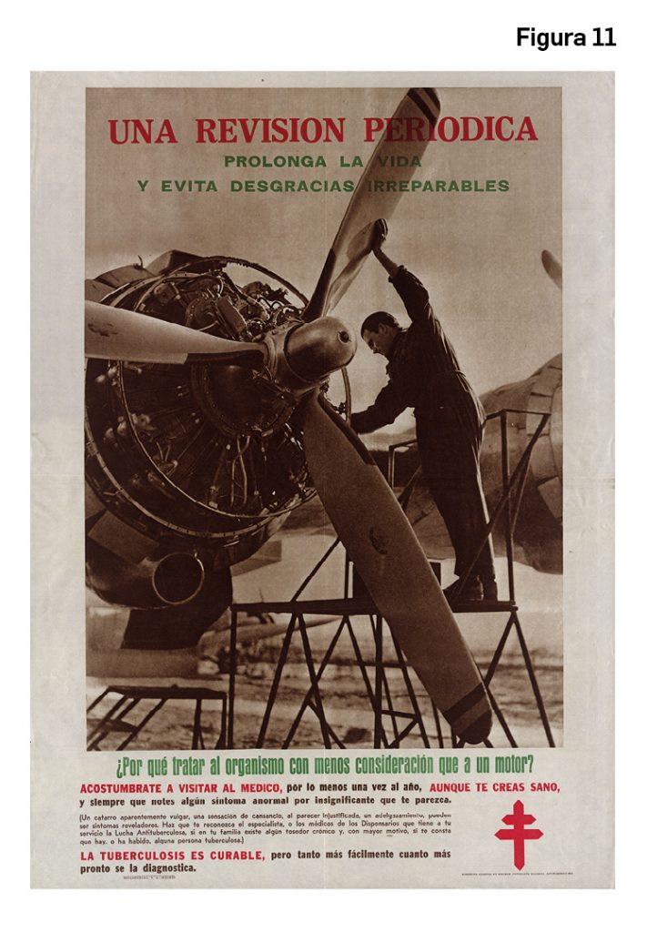 Otra fotografía de la misma época, editada por idéntica institución y con el mismo tamaño (50×70 cm) incita a realizarse una revisión periódica, con el fin de evitar daños irreparables. Para ello se emplea la fotografía de un mecánico, perfectamente repeinado, con empleo masivo de brillantina al uso de la época, en el momento de revisar un avión, aparentemente de un tetramotor, parece que civil por el mono empleado por el trabajador (Figura 11). Pese a lo avanzado de la fecha, una estética muy similar a la de la revista Signal, la dedicada a la propaganda nazi en España, en esas fechas desaparecida hacía tiempo, pero con una forma de presentar los asuntos seguramente del gusto de la Falange, ya domeñada en el Movimiento Nacional, más dedicada a las formas que a lo sustantivo de su ideario.