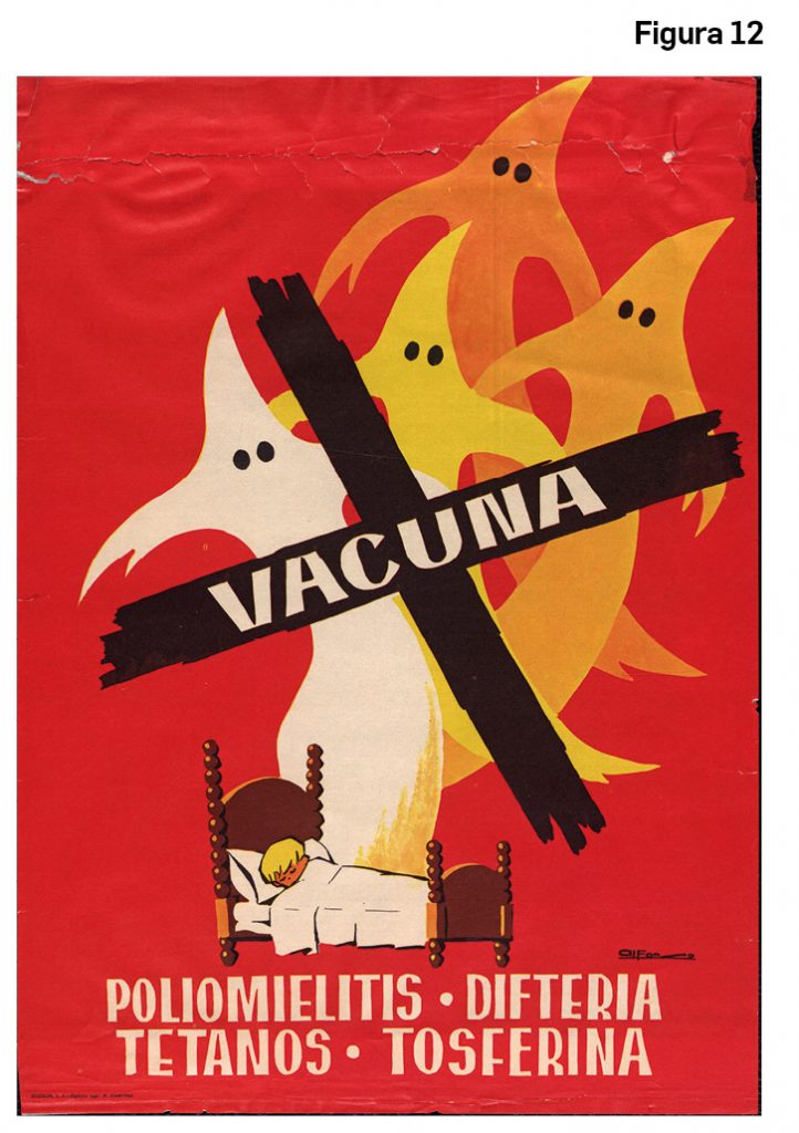 En 1963 se inició la vacuna oral frente a la poliomielitis12 y en 1965 se añadió frente a la difteria, tétanos y tosferina. El muy atractivo cartel es del año siguiente y trata de atraer al público a inmunizar a sus hijos (Figura 12).