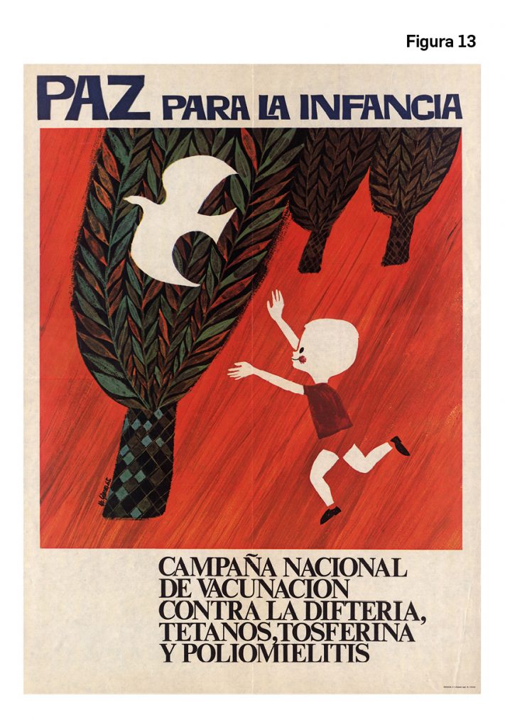 El problema estriba en que la primera campaña nacional de vacunación, para la que se utilizó la vacuna oral de Albert Sabin, se llevó a cabo entre 1963 y 1964, pese a que estaba disponible desde 1957. Otro método de inmunizar, mediante el inyectable de Jonas Salk, existía desde 195413. Por ello la polio se erradicó tardíamente en nuestro suelo y dejó a muchas personas con secuelas hasta fechas contemporáneas. En el año 1966 la campaña pública de vacunación estaba en pleno rendimiento y por eso los carteles. Hablo en plural pues también tenemos otro, mucho más grande (49×67 cm) publicado en la misma imprenta y realizado durante el año 1965 por “Yo, Gimeno”14 en donde se ve a un niño que corre tras una paloma blanca, en medio de unos probables olivos sobre fondo rojo, en un grafismo de evidente calidad (Figura 13).