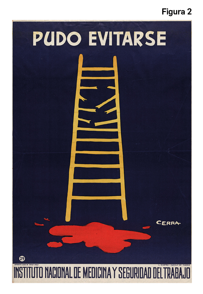 En 1963, el Instituto Nacional de Medicina y Seguridad del Trabajo publicó un impactante cartel (34×49 cm) en el que, sobre fondo negro, se ve una escalera con los peldaños rotos, una mancha de sangre en el suelo y la leyenda Pudo evitarse3, en donde, de manera sencilla y explícita, se llama al buen estado de los utensilios necesarios para el trabajo (Figura 2).
