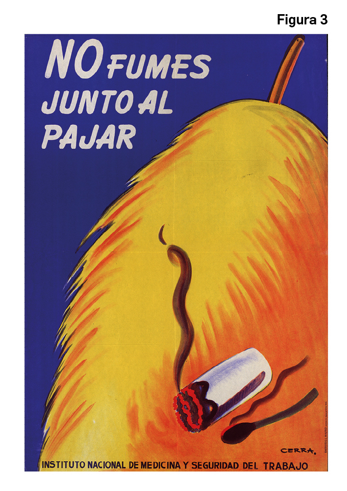 El mismo Instituto, con idéntico autor y el mismo año, hizo imprimir un letrero de gran formato (55×79 cm)4 a través del cual se pretendían prevenir los fuegos accidentales en las parvas de las eras y en los pajares, mediante el consejo de no fumar allí. El asunto, aparte de ser de sentido común, llama hoy en día la atención, dado lo asumido que en esa época se tenía el tabaco y su consumo, incluso por las autoridades sanitarias (Figura 3).