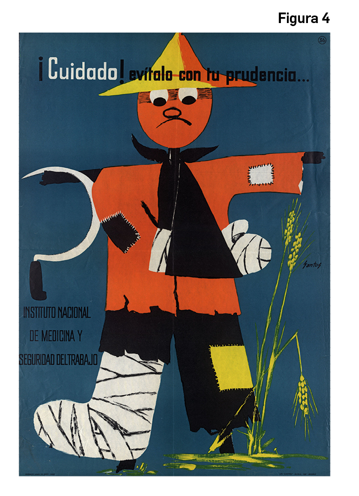 De nuevo, idéntico Instituto, probablemente el mismo año, llamaba a la prudencia entre los labradores. Para ello, en otro anuncio de gran tamaño (69×49 cm)5 se representa el dibujo de un espantapájaros con cara triste, la mano en cabestrillo y la pierna vendada. La presencia en el dibujo de una hoz inclina a pensar en una campaña contra los accidentes en la siega y que, aún durante ese año tardío, se realizaba muy corrientemente a mano. Llama la atención el tema. El uso de la zoqueta, para evitarse heridas en las manos, estaba muy generalizado, al menos en Castilla, y los cortes en las piernas sólo podían deberse a una gran impericia o a un exceso de prisa (Figura 4).