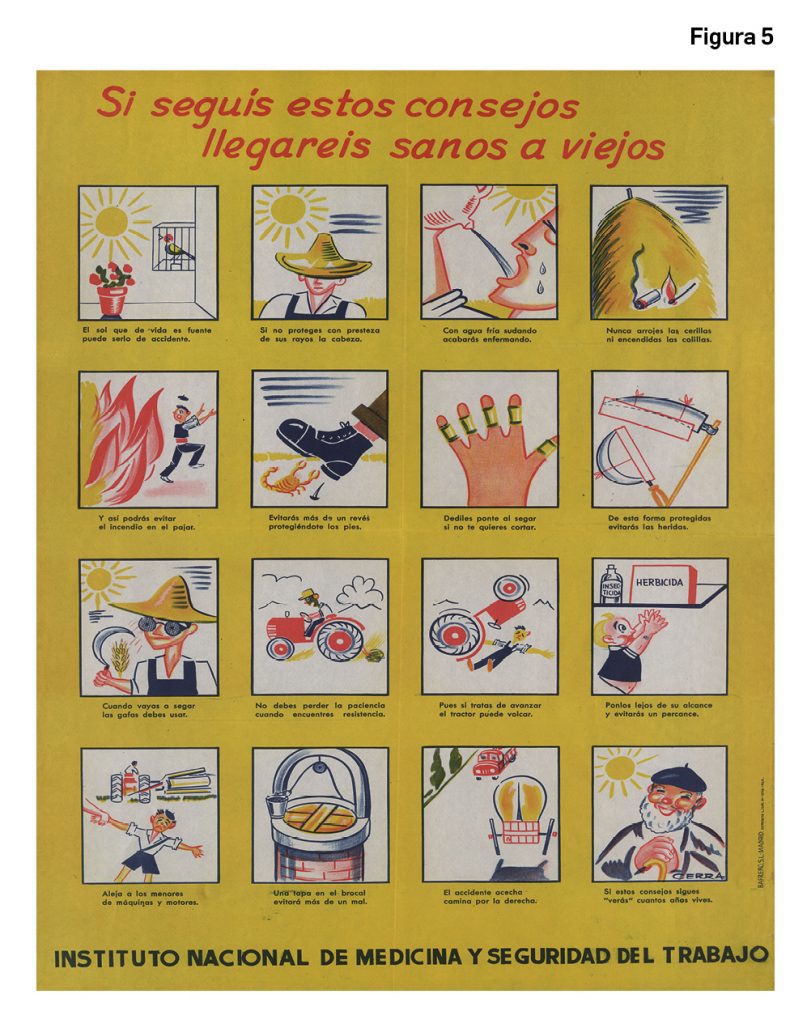 Este cartel, procedente de la España de mi infancia, cuenta en imágenes cómo era en ese momento la nación. El trabajo, principal y mayoritario tenía que ver con la agricultura. Por tanto, los consejos van dirigidos a los campesinos, mediante una serie de pareados muy sencillos e infantiles –generalmente de su gusto– y unos dibujos tremendamente expresivos. El sombrero del agricultor es de paja y su vestido, un mono azul de trabajo; bebe del botijo y esa agua (que hoy tendríamos por fresquita) se considera excesivamente fría en determinadas ocasiones laborales6; quien huye del fuego lleva faja, chaleco corto y boina; las botas de protección tienen una gran semejanza con las empleadas por los soldados, al hacer el servicio militar, obligatorio durante esos años. La siega con hoz o guadaña parece cosa normal y habitual. Las novedades son las gafas de protección frente a las espigas, los primeros tractores (y, por tanto, el desconocimiento todavía de su manejo como herramienta cotidiana), los herbicidas y otras máquinas agrícolas adosadas al tractor, en lo que parece ser una primitiva segadora, aunque también las había arrastradas por caballerías. Sin embargo, los pozos siguen en pleno auge, pues se pide la tapa en los brocales para evitar problemas, lo que habla de la ausencia de agua corriente en muchas poblaciones y, en la carretera, vemos a un carro circulando frente a un camión de medianas proporciones. En definitiva: un territorio rústico tradicional, camino de la mecanización y varios accidentes producidos por ese tránsito y por la costumbre tan extendida de fumar. Una España de casas con paredes encaladas, resplandecientes al sol, macetas y pajarillos en jaulas, muy alejada en el tiempo y en las costumbres de la actual.