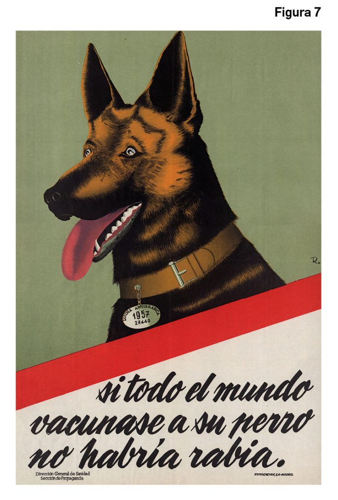 Años antes, cuando el Régimen se había alejado del fascismo alemán tras su derrota militar, pero todavía quedaban instituciones y denominaciones de tiempos más duros, la Dirección General de Sanidad, en su sección de propaganda, efectuó una campaña mediante la cual hizo imprimir a la editorial Rivadeneyra S.A. de Madrid, en el año 1957, un cartel (47×69 cm) en donde se ve a un hermoso perro de los llamados pastores alemanes dotado de collar en donde aparece un número de la lucha antirrábica grabado en una chapa metálica colgante (Figura 7).