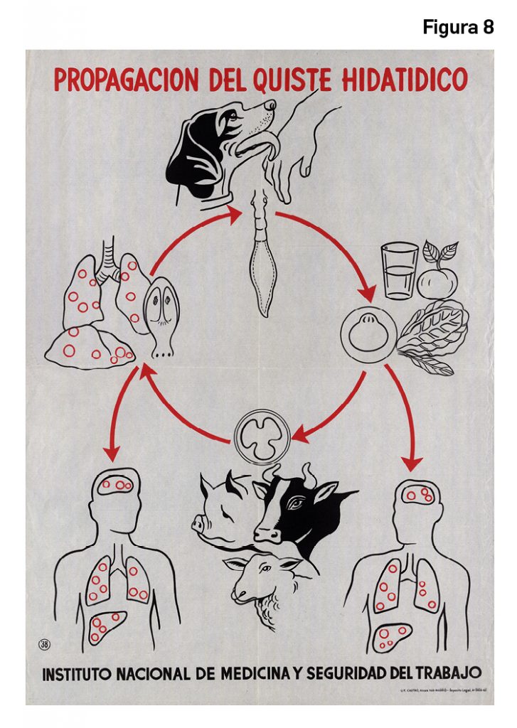 En el mismo sentido, pero en el año 1968 tenemos un nuevo cartel (50×70 cm) editado por el Instituto de Medicina y Seguridad del Trabajo en donde se indica como se propaga el quiste hidatídico (Figura 8).