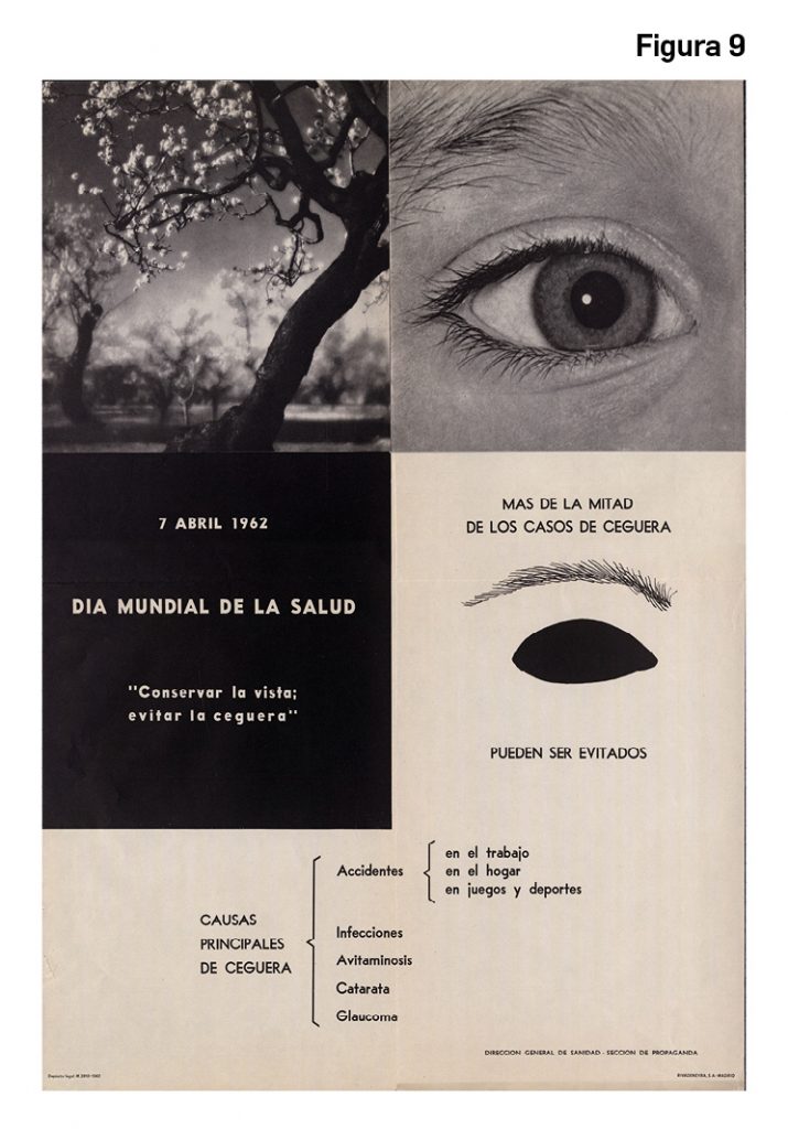 Uno de ellos (48×69 cm), editado por la sección de propaganda de la Dirección General de Sanidad en la imprenta Rivadeneyra de Madrid, está dirigido a Conservar la vista: evitar la ceguera. Mantiene, mediante una curiosa mezcla de fotografías en blanco y negro, algún dibujo y varios mensajes escritos, que más de la mitad de los casos de ceguera pueden evitarse y los atribuye a accidentes, en el trabajo, en el hogar o en juegos y deportes. A infecciones, avitaminosis, cataratas y glaucoma, circunstancias, supongo, sobre las que desea poner sobre aviso a la población.