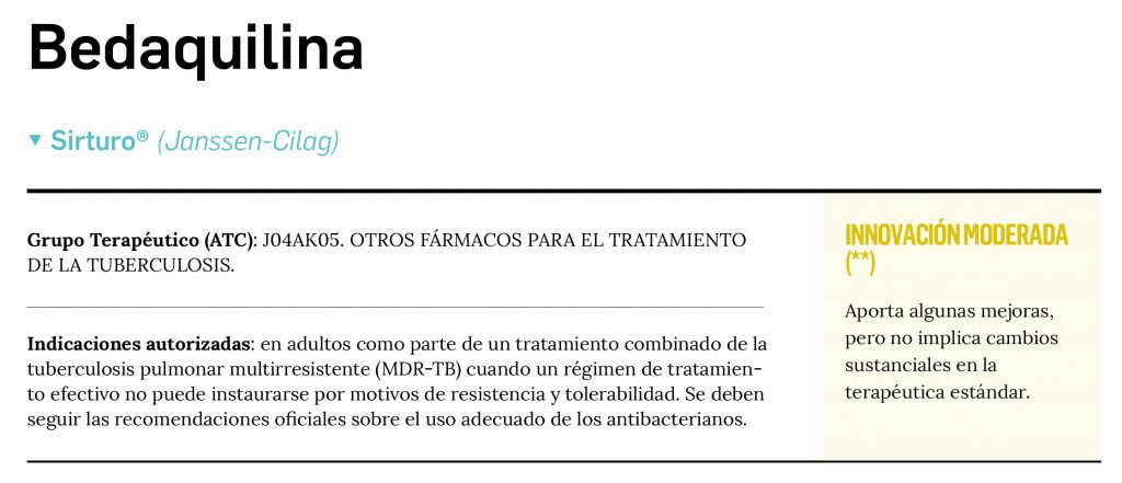 En definitiva, se trata de la primera arilquinolina aprobada para el tratamiento de la tuberculosis multirresistente, con un innovador mecanismo de acción en la indicación (inhibición de la ATP sintasa de M. tuberculosis). Su inclusión en un régimen combinado de tratamiento, especialmente junto con un aminoglucósido inyectable y/o una fluoroquinolona, permitirá incrementar la eficacia en la erradicación de las micobacterias, además de relacionarse con un perfil de seguridad aceptable, a pesar de las incertidumbres en cuanto a su potencial arritmogénico y su hepatotoxicidad. En el contexto de un tratamiento complejo y de larga duración en el que la aparición de resistencias intra-tratamiento es frecuente, bedaquilina puede contribuir a afrontar una necesidad médica no cubierta, pero la limitación de su indicación a la ausencia de alternativas impide por ahora considerarlo como un progreso disruptivo en el tratamiento de la tuberculosis multirresistente.