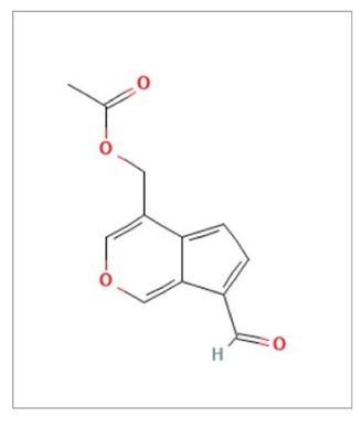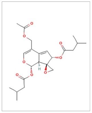 Los valepotriatos son ésteres epoxi iridoides cuyo contenido total se encuentra generalmente entre el 0,5 y el 1,2%; entre ellos se encuentran valtrato (en una proporción que supone aproximadamente el 80% de los valepotriatos) (Figura 3), acevaltrato, dihidrovaltrato, isovaltrato, isovaleroxi-hidroxi-dihidrovaltrato. Son compuestos muy inestables, pudiendo descomponerse fácilmente por el calor, la humedad o incluso las variaciones del pH, por lo que solo se encuentran en la planta fresca. Sin embargo, existen pequeñas cantidades de estos compuestos cuando el material vegetal se deseca a una temperatura inferior a 40ºC. Al ser insolubles en agua, los valepotriatos solo podían obtenerse en preparaciones no acuosas. Aunque inicialmente se pensó que los valepotriatos eran los principios activos, se comprobó posteriormente que estos compuestos, al ser químicamente inestables, se degradan con facilidad, se absorben mal y no se encuentran en infusiones y tinturas. En cambio, sus productos de degradación, los baldrinales (aldehídos insaturados), se encuentran en dichas preparaciones y pueden explicar gran parte del efecto sedante de la valeriana. El baldrinal (Figura 4) y el homobaldrinal son los productos de degradación del valtrato y el isovaltrato respectivamente.