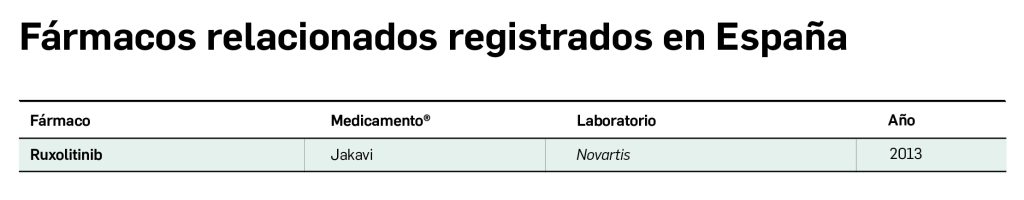La hidroxiurea (o hidroxicarbamida) se utiliza como tratamiento citorreductor y tiene indicación específica en esplenomegalia. Sin embargo, solo permite obtener respuestas parciales y de corta duración (AEMPS, 2023). La introducción de ruxolitinib, un inhibidor selectivo de las tirosina cinasas de tipo Janus JAK1 y JAK2, permitió obtener mejores respuestas en los síntomas asociados a la esplenomegalia, aunque su utilidad clínica en la mejora de la supervivencia no está clara (EMA, 2021). Sin embargo, no se dispone de alternativas farmacoterapéuticas para los pacientes que no responden o en los que se pierde la respuesta a ruxolitinib.