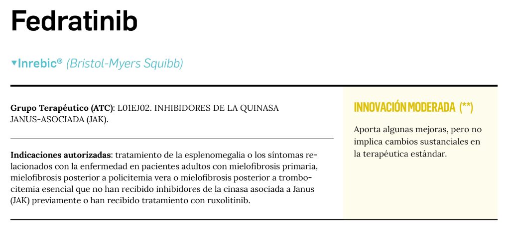 Fedratinib, como inhibidor de la cinasa asociada a Janus, no incorpora un mecanismo de acción totalmente novedoso, aunque la inhibición dual de JAK2 y FLT3 es una aproximación innovadora en el tratamiento de la MF. Su perfil de eficacia y seguridad parece comparable al de ruxolitinib, con algunas diferencias relacionadas con la mayor selectividad del nuevo fármaco por JAK2, como una mayor toxicidad gastrointestinal y menor toxicidad hematológica (EMA, 2020). A pesar de las incertidumbres respecto a la duración de la respuesta y al riesgo de aparición de encefalopatía, fedratinib se posiciona como la principal alternativa en el manejo de la esplenomegalia asociada a MF en pacientes refractarios o no candidatos a recibir ruxolitinib.