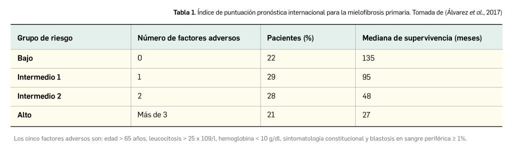 La mediana de supervivencia en los pacientes con MFP es de 5-7 años (Alegre et al., 2017). Sin embargo, los pacientes sin ninguna característica adversa, excepto la edad, tienen una mediana de supervivencia de más de 10 a 15 años (mediana de 135 meses), pero la presencia de uno de los mencionados factores adversos la reduce a 95 meses (7,9 años), dos factores a 48 meses (4 años) y tres o más a 27 meses (2,25 años) (Tabla 1). Las anomalías cariotípicas también pueden afectar al pronóstico. En este sentido, algunas series retrospectivas han permitido observar que las deleciones 13q y 20q y la trisomía 9 se han correlacionado con una mayor supervivencia y ninguna transformación leucémica, en comparación con el peor pronóstico de la trisomía 8, un cariotipo complejo, -7/7q-, i(17q), inv(3), -5/5q-, 12p- o el reordenamiento 11q23.