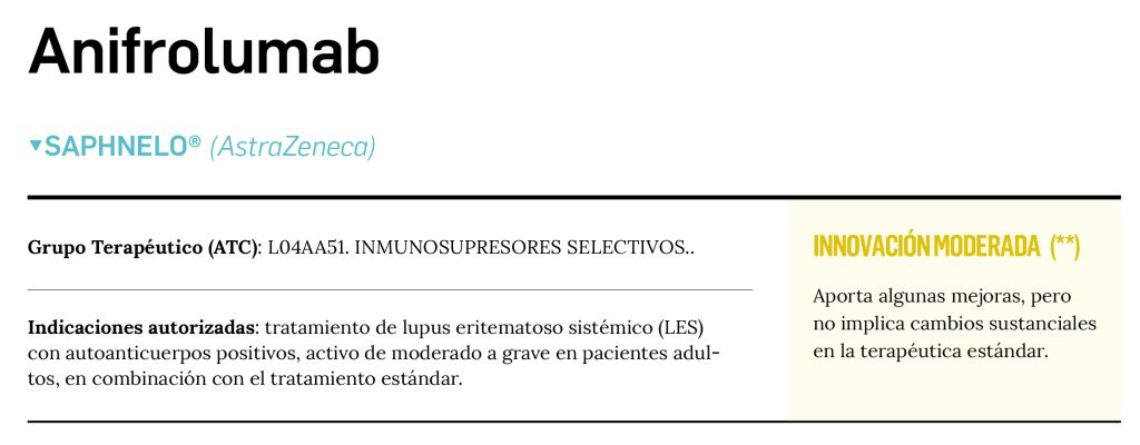 En definitiva, anifrolumab incorpora un nuevo mecanismo de acción en el tratamiento del LES. Dada la escasez de tratamientos específicamente dirigidos a dianas relacionadas directamente con la patogenia de la enfermedad y teniendo en cuenta el alcance de los efectos adversos asociados al tratamiento crónico con corticosteroides e inmunosupresores, se puede considerar que, aunque de magnitud escasa, la eficacia de anifrolumab resultaría de relevancia clínica. La posibilidad de reducir la dosis de corticoides al introducir el fármaco podría explicar en parte la menor proporción de eventos adversos graves observados en los estudios de fase 3. Si bien sus efectos adversos a largo plazo no se conocen completamente y requieren de seguimiento dado su carácter inmunosupresor, los datos disponibles parecen apuntar a un perfil toxicológico más benigno que el asociado a las dosis altas de corticoides. Así, anifrolumab se posiciona por el momento como una alternativa a belimumab únicamente en pacientes adultos sin complicaciones renales o neuropsiquiátricas.