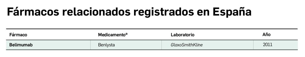 Rituximab, autorizado para su uso en artritis reumatoide, se está usando también en pacientes con LES o vasculitis graves (especialmente afectación renal), aunque tal indicación no está reconocida oficialmente, y en cualquier caso, en combinación con algún inmunosupresor (como el micofenolato). Por su parte, belimumab es un anticuerpo monoclonal humano recombinante de tipo IgG1λ que se une selectivamente e inhibe la actividad biológica del estimulador de linfocitos B soluble (BLyS), implicado en la promoción de la supervivencia y la diferenciación de los linfocitos B. Belimumab cuenta con indicación en el tratamiento adyuvante en pacientes adultos con LES activo, con autoanticuerpos positivos y con un alto grado de actividad de la enfermedad (por ejemplo, anti-ADNdc positivo y bajo nivel de complemento) a pesar del tratamiento estándar. Su acción inhibitoria sobre el BLyS en pacientes con LES permite reducir la cantidad de subpoblaciones seleccionadas de linfocitos B y de autoanticuerpos, y normalizar los niveles de inmunoglobulinas y del complemento.
