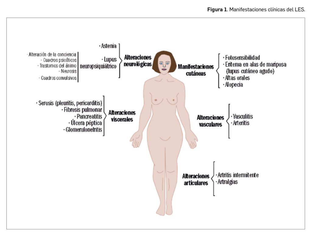 El lupus eritematoso sistémico (en adelante, LES) forma parte de un amplio conjunto de patologías, referidas habitualmente como enfermedades autoinmunes sistémicas, provocadas por una reacción anómala del sistema inmunitario del paciente frente a estructuras normales del propio paciente (autoinmune), capaces de afectar a varios órganos y/o tejidos (sistémico). En particular, el LES es un proceso muy heterogéneo en su presentación clínica (Figura 1): aunque las manifestaciones clínicas más frecuentes son las cutáneas, son también muy frecuentes la astenia y las artralgias. Además, puede presentarse artritis de forma intermitente, que afecta especialmente a las manos, pero también a otras articulaciones. La afectación visceral es frecuente y dispersa, pudiendo verse afectado cualquier órgano, desde el riñón, en forma de glomerulonefritis, hasta el sistema nervioso central (lupus neuropsiquiátrico) o los aparatos cardiovascular, pulmonar o digestivo. Es precisamente la diversidad de las posibles afectaciones orgánicas es la que determina la condición de sistémico del LES.
