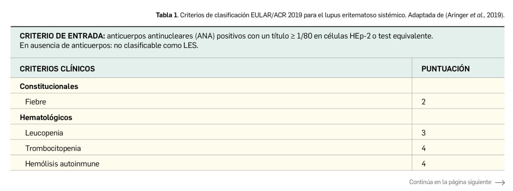 A nivel diagnóstico se recurre a una serie de criterios que permiten distinguir el LES de otras enfermedades autoinmunes en las que pueden presentarse manifestaciones clínicas similares, como la artritis reumatoide. Uno de los documentos más empleados es el elaborado de manera conjunta por la European Alliance of Associations for Rheumatology (EULAR) y el American College of Rheumatology (ACR) (Aringer et al., 2019), que puede consultarse en la Tabla 1. De acuerdo a estos criterios, se podrá considerar que un paciente padece LES cuando cumpla el criterio de entrada, al menos un criterio clínico y tenga una puntuación total igual o mayor a 10, considerando criterios clínicos e inmunológicos.