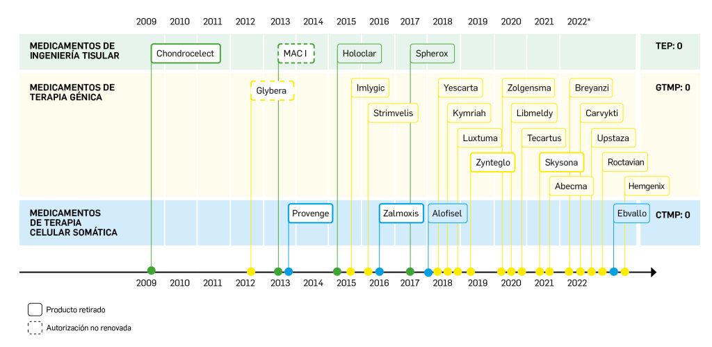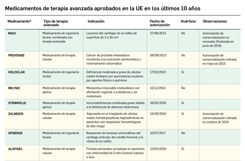 La siguiente tabla recoge los medicamentos de terapia avanzada que han recibido autorización de comercialización en la UE durante en los últimos 10 años (2013-2023).