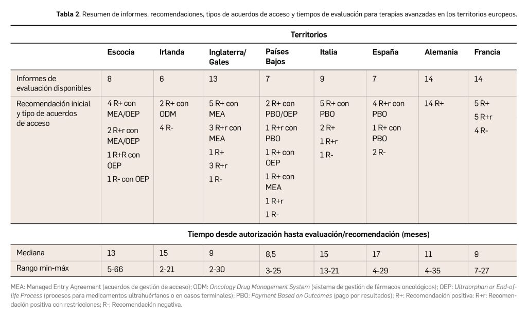 En este trabajo los autores realizan una comparación de las recomendaciones para la financiación y reembolso de las terapias avanzadas disponibles hasta diciembre del 2021 en 8 territorios de la Unión Europea: Irlanda, Inglaterra/Gales, Escocia, Países Bajos, Francia, Alemania, España e Italia (Tabla 2).