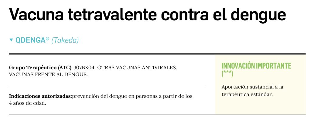 A pesar de no tratarse de la primera vacuna tetravalente de virus vivos atenuados frente al dengue –pues Dengvaxia® fue autorizada por la Comisión Europea en 2018–, Qdenga® parece superar las limitaciones de su predecesora, con una capacidad de prevención elevada frente a todos los serotipos del virus –aunque probablemente mayor frente a DENV-2– y un perfil de seguridad benigno, en el que no se ha identificado hasta ahora un mayor riesgo de dengue grave entre las personas vacunadas e inicialmente seronegativas, aunque esto deberá ser confirmado en análisis basados en datos del mundo real, con un número de vacunados muy superior al de los estudios clínicos. Por tanto, teniendo en cuenta las limitaciones relativas a la prevención basada en evitar en contacto y a la ausencia de otras medidas farmacológicas de prevención o tratamiento con antivirales, la nueva vacuna tetravalente supone un significativo avance en la lucha frente a una infección actualmente en expansión y de consecuencias potencialmente muy graves.