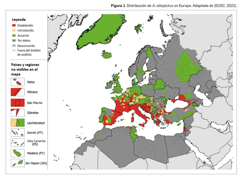 El virus del dengue se clasifica dentro de la familia Flaviviridae, en el género Flavivirus. Aunque es habitual referirse al virus del dengue de forma singular, se distinguen al menos cuatro serotipos distintos del virus, denominados por lo general como DENV-1, DENV-2, DENV-3 y DENV-4, todos ellos patogénicos y capaces de ocasionar desde una infección asintomática hasta enfermedad grave. La trasmisión a humanos se produce a través de la picadura de distintas especies de mosquitos del género Aedes (A. albopictus y A. aegypti)1, cuya distribución se ha ido expandiendo desde zonas subtropicales y tropicales hacia regiones de clima moderado en todo el mundo (Figura 1). Se estima que se producen entre unos 300 y 500 millones de infecciones cada año, de las cuales unos 100 millones provocan algún síntoma (Bhatt et al., 2013), con 2500 millones de personas en riesgo de infección. Las áreas consideradas endémicas son principalmente las zonas tropicales y subtropicales: América Latina –incluyendo México, pero con baja o nula presencia en Chile y Argentina– y el Caribe, sudeste y sur de Asia y buena parte del África subsahariana. Se debe tener en cuenta que A. albopictus está presente en amplias zonas del continente europeo y que en esta región ya se han reportado algunos casos autóctonos2, aunque la mayor parte de los casos registrados en Europa son adquiridos e importados desde zonas endémicas.