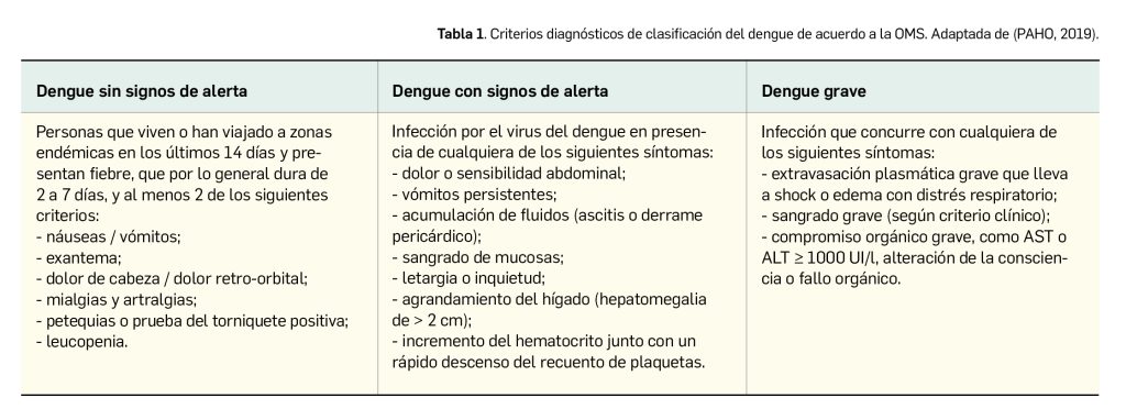 Aunque la infección puede ser asintomática, en la mayor parte de los casos se producirán al menos algunos síntomas que, junto con otros factores, entre los que destaca el haber estado en una zona endémica de dengue, orientarán el diagnóstico. En este sentido, la Organización Mundial de la Salud (OMS), elaboró en el año 2009 una clasificación que establece tres categorías de gravedad de la infección por el virus del dengue.