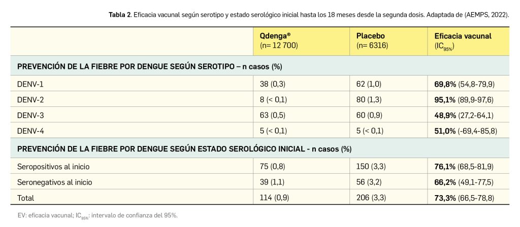 Cabe mencionar dos aspectos importantes en relación con la eficacia de la nueva vacuna. Por un lado, que la capacidad de prevención de la hospitalización y la fiebre, aunque elevada, es variable dependiendo del serotipo, resultando superior frente a la infección por DENV-2. Además, la inmunoprotección también fue superior en aquellos participantes que eran seropositivos al inicio del estudio (Tabla 2).