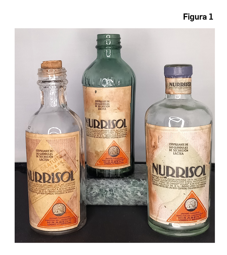 Tenemos el específico NURRISOL, fabricado en el laboratorio Mirabent de Barcelona, cuando su director técnico era Joaquín Puchades. Sabemos que era un centro de preparación de medicamentos propiedad de una sociedad, que preparaba específicos propios y adquiridos a otra marca comercial. Los frascos de la imagen, de diversos colores y tamaños, con una altura de unos 15,5 cm y un diámetro de la base de unos 5 cm, son de la época en que el médico y farmacéutico Joaquín Puchades y Aviñó, era su director técnico en un abanico de años entre 1928 y los tiempos de la posguerra civil de 1936-19391 (Figura 1).