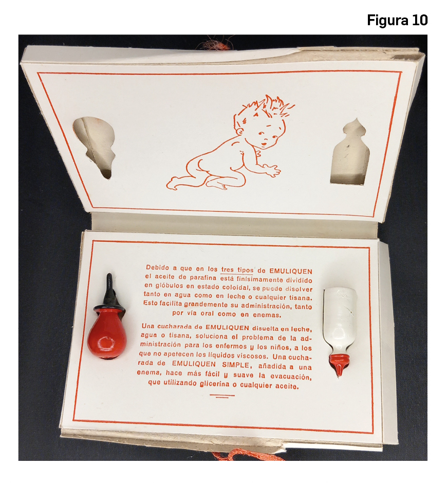 El Emuliquen, un laxante, hacía propaganda de su producto mediante el regalo de una cajita en donde se contenían una pera de irrigación y un biberón, para indicar que se disolvía en leche, en agua o tisanas y así hacía más fáciles las evacuaciones (Figura 10).