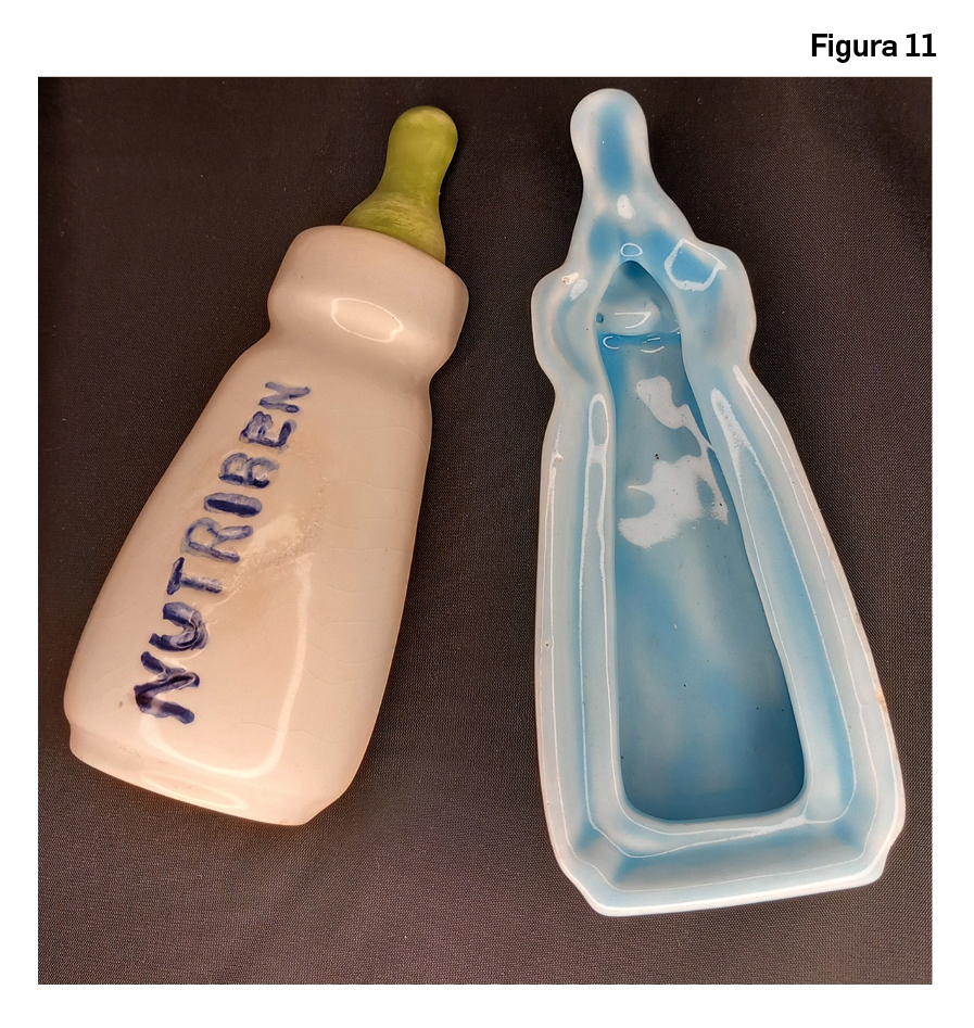 También Nutriben regaló un biberón de cerámica de 14 cm de largo por 5 cm de ancho y con una profundidad, en su base, de 5,5 cm, barnizado en blanco con letras en azul ultramar y con la mitad superior en blanco, la tetina en verde y la parte inferior en azul celeste. Esa marca de productos infantiles pertenece al grupo Alter y es una leche de inicio. Trata de imitar a la leche materna e intenta evitar el estreñimiento en los bebes8 (Figura 11).