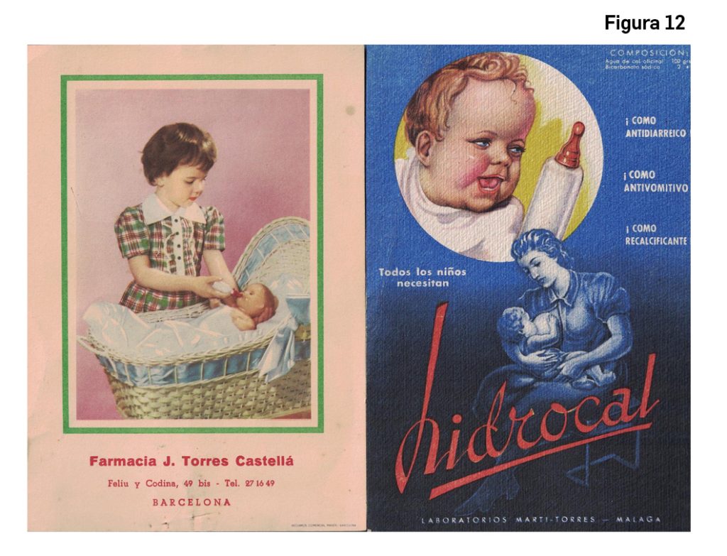 También el licenciado J. Torres Castellá regalaba a su clientela un cartelito, con ánimo de que pudiera ser utilizado como decoración, pues llevaba unos cordones para colgarlo. En él se ve a una niña jugando con un muñeco colocado en un capazo o carrito de bebés a quien da de comer mediante un biberón de juguete. Este anuncio sí puede considerarse sexista y da cuenta de la manera de pensar en la muy española en Cataluña a mediados del siglo pasado, pues contiene todos los elementos de establecimiento de un papel predeterminado para las niñas, no por el empleo de juguetes mediante los cuales se la va entrenando en lo considerado como su principal función, sino por todo el paquete publicitario: el fondo de la niña es rosa, el capazo en donde debe estar un varón tiene un ribete de seda azul e incluso se han retocado los labios de la niña para que parezcan más rojos. En definitiva, un horror de estética kitsch, muy representativo de la España de mediados de siglo y, si se quiere, un motivo de escándalo para algunas feministas, que no sé bien porqué nuestro colega eligió como regalo y anuncio de su farmacia; tal vez porque se lo ofrecieron a buen precio o vio en él algo absolutamente neutro, simpático y sin problema alguno, ni político, ni social (Figura 12).