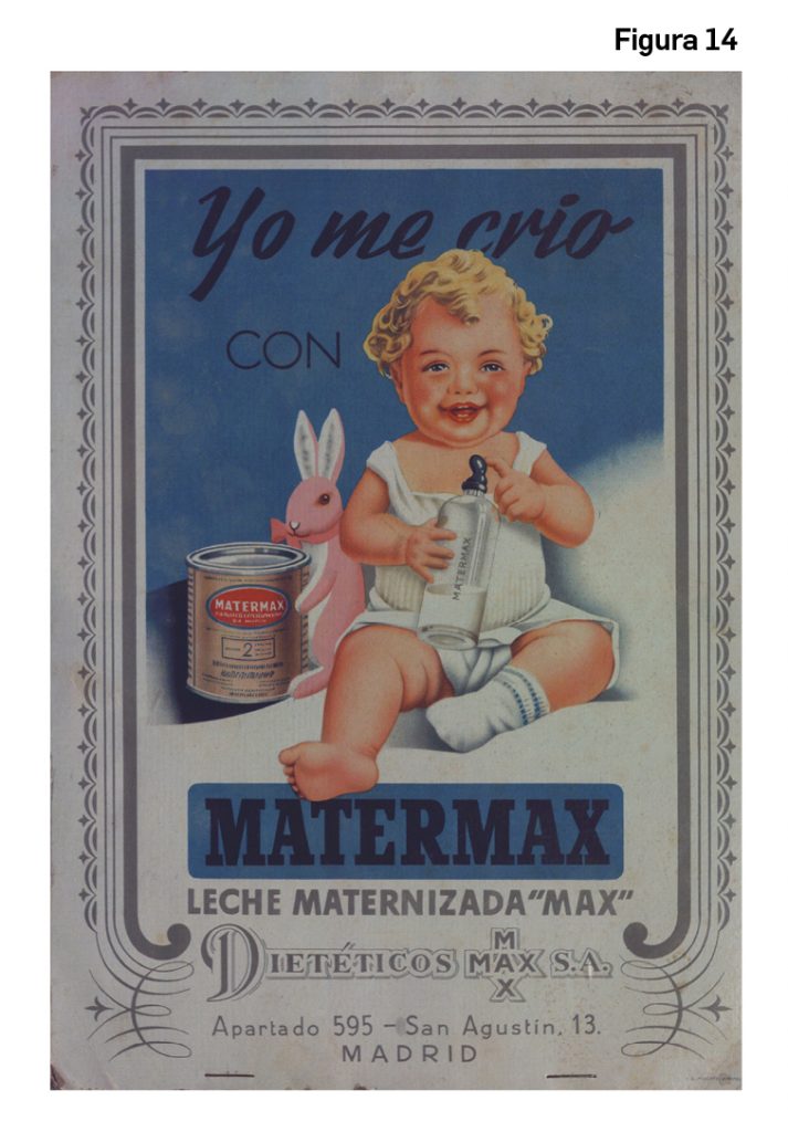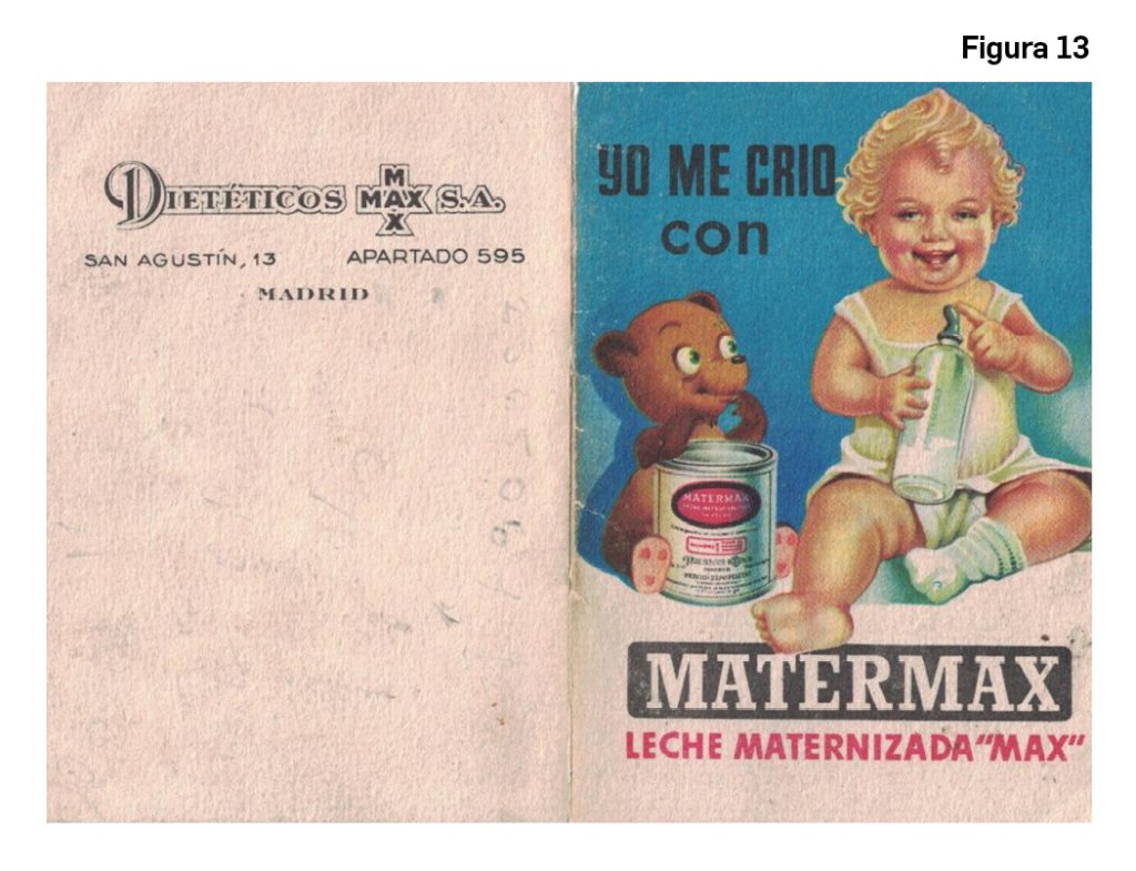 En 1940, la Leche maternizada “Max” entregó un calendario, cuyo reveso estaba adornado con un niño rubio casi platino, de pelo ensortijado que juega con un biberón, mientras detrás le observa un osito de peluche emboscado tras una lata del mencionado alimento (Figura 13).