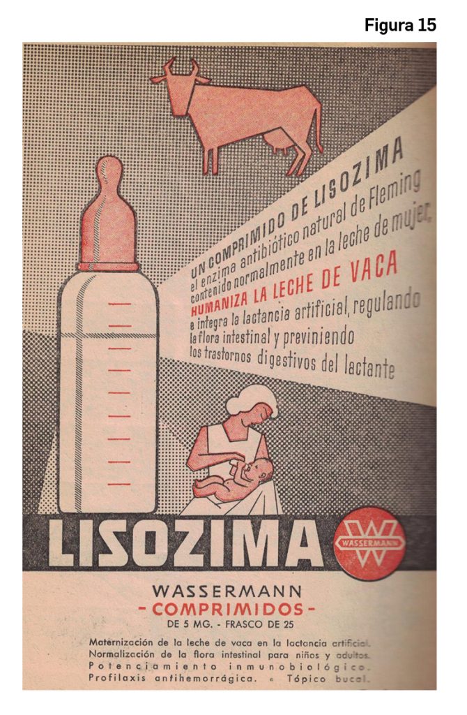 Por último, en nuestra colección, tenemos un anuncio del año 1961 del laboratorio Wassermann11 (22×15 cm) (Figura 15) en donde se emplea un biberón, una mujer dándole de comer a un bebé y una vaca para anunciar la Lisozima, una enzima, presente en las lágrimas, la saliva y la leche materna cuya actividad antibiótica descubrió Alexander Fleming (1881- 1955)12 en el proyecto de investigación que dirigía cuando, de manera accidental, descubrió la penicilina. El laboratorio mantenía que con ese compuesto se maternizaba la leche de vaca13.