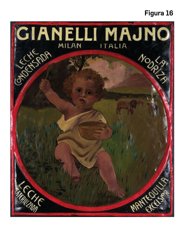En nuestra colección tenemos una chapa de gran tamaño (60×50 cm) (Figura 16) en la que se anuncia la Leche condensada la Nodriza, fabricada con leche esterilizada y mantequilla excelsior por Gianelli Majno en Milán (Italia), de la cual no tengo muchos más datos.