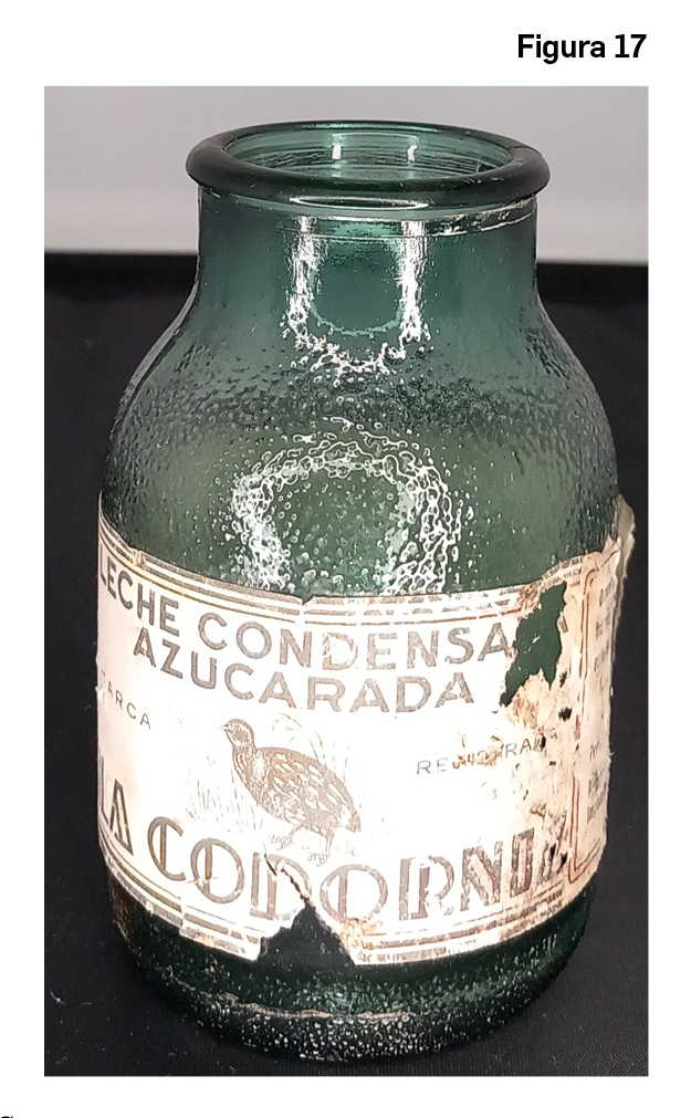 Junto a ella, y también sin más datos, tenemos un frasco de vidrio verde claro de 11 cm de altura y un diámetro de 6,5 cm en la base y 4 cm en la boca de leche condensada azucarada la Codorniz, que contenía unos 370 gramos de producto y se fabricaba con leche de Bárcena (Santander) (Figura 17).