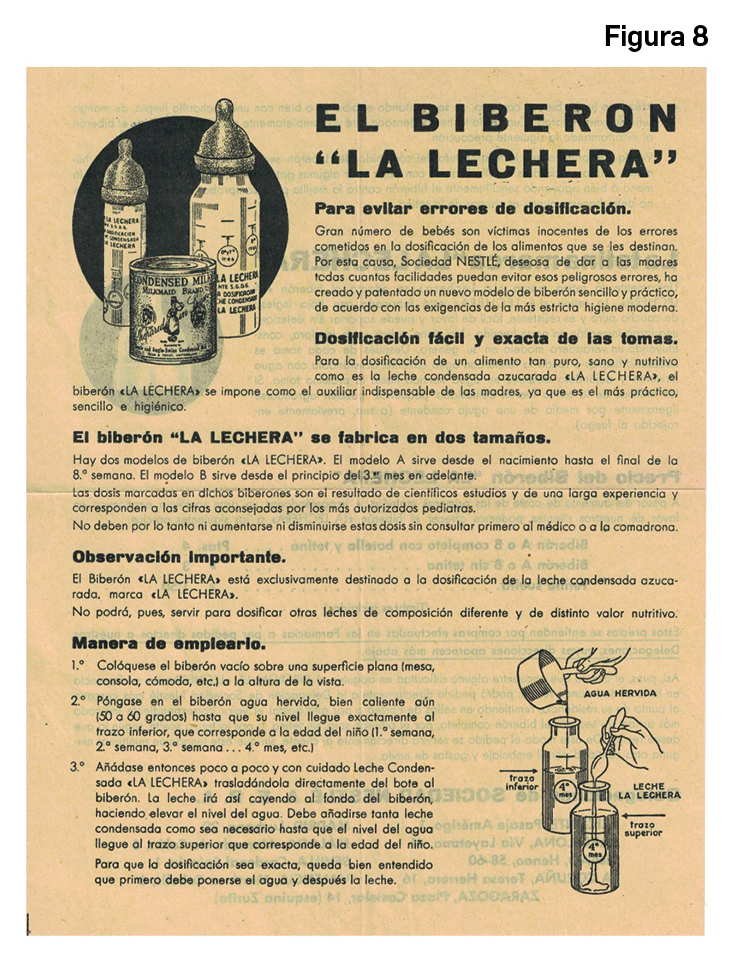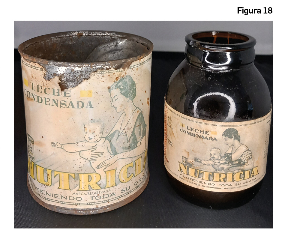 También una lata de 10 cm de altura por 9 cm de base y boca y un frasco de vidrio marrón de 11 cm de altura 6 cm de diámetro en la base y 4 cm en la parte superior, de leche condensada nutricia15. Se publicitaba diciendo que conservaba toda su grasa. La fabricaba la granja Soldevila en Olot (Gerona) (sic) y en el frasco ofrecían una tabla de cantidades a utilizar por los niños desde una semana hasta siete meses en adelante (Figura 18).