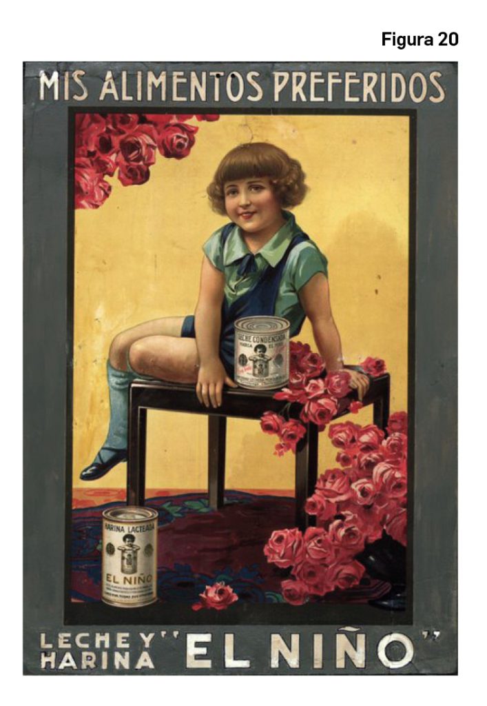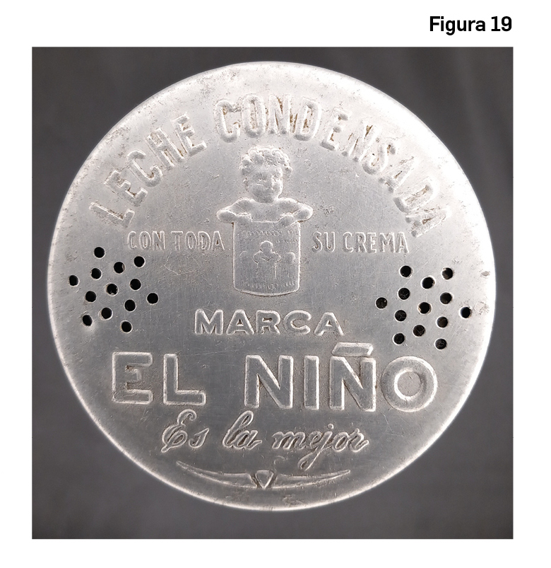 Entre los folletos dedicados a ayudar en la crianza de los niños, comentados en el artículo anterior, mencionamos dos de la leche condensada el Niño, en donde explicábamos su procedencia y la manera que tuvo de hacer su publicidad. Falta de mencionar una tapa de la misma, existente entre los objetos de nuestra colección, de 7,5 cm de diámetro (Figura 19) y un cartel de propaganda (Figura 20) que al contrario del antes mencionado de la farmacia de J. Torres Castellá, sería muy bien recibido en la actualidad, porque no se sabe muy bien si es niño, niña o niñe y, aunque va con ropa de color azul, los adornos fundamentales son rosas de su color más habitual.