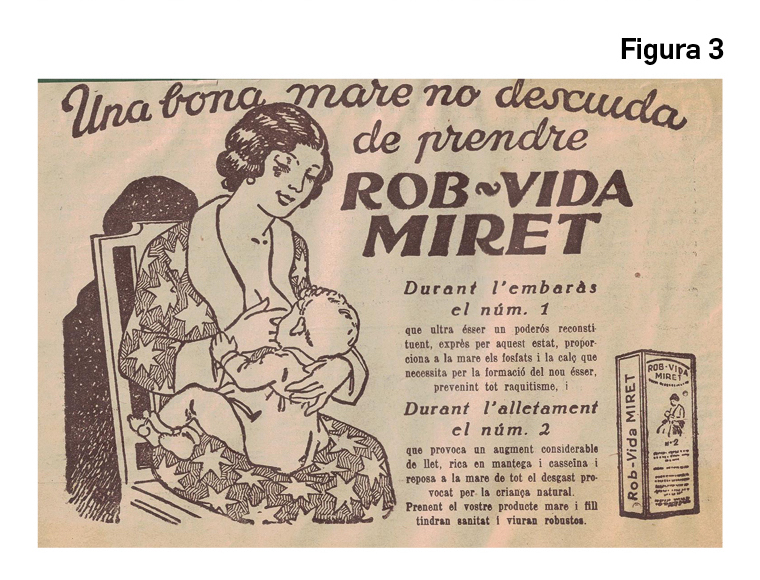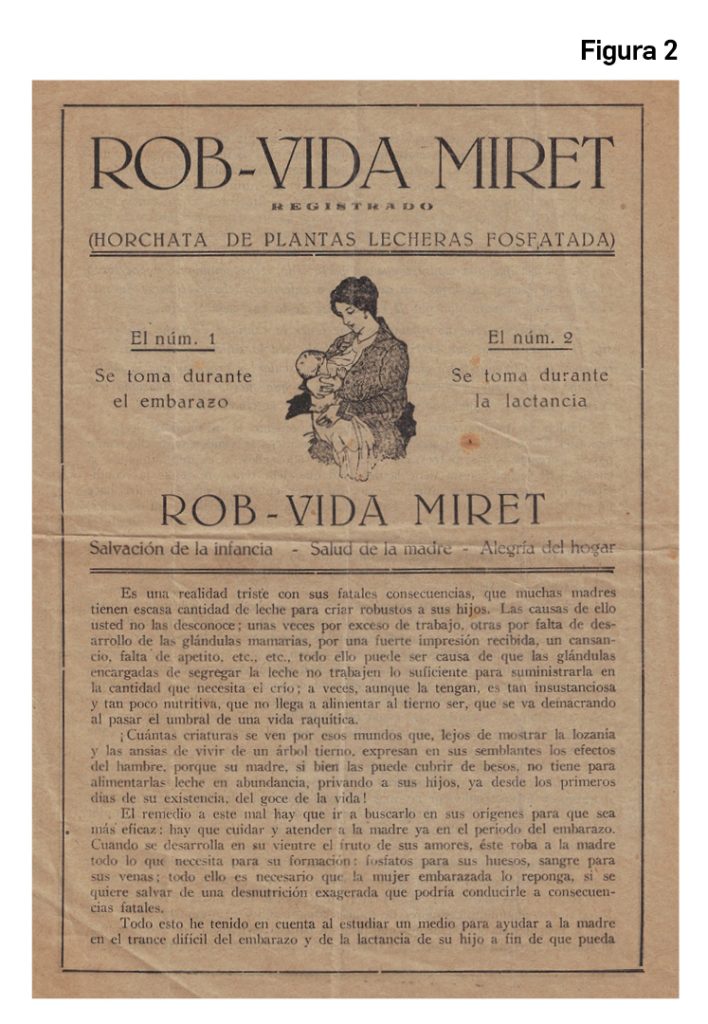 Otro medicamento, cuya propaganda poseemos, es el Rob-Vida Miret, presentado como una horchata de plantas lecheras fosfatada y en dos modos: uno para tomar durante el embarazo y otro durante la lactancia.