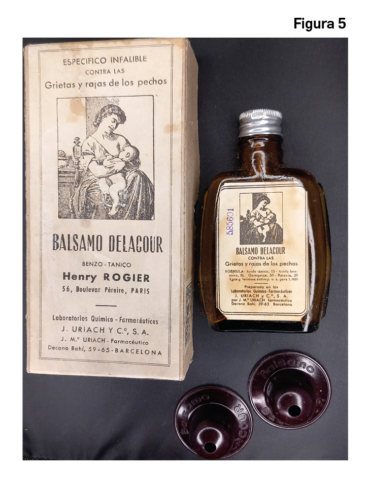 Lo presentaban como analgésico rápido y aislador. Indicaban que formaba una película muy flexible sobre el pezón, mediante la cual se impermeabilizaba sin causar impedimento a la succión. Pese a ello, en la presentación del específico (Figura 5) añadían un par de pezoneras de baquelita, las cuales evidentemente impedirían las contrariedades producidas al amamantar, pero nos tememos que dificultarían mucho la succión, si bien estos utensilios los hemos visto de los más variados materiales; desde la madera hasta el papel, pasando por la hoja de lata.