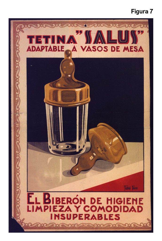 En primer lugar, poseemos un cartelito (34×22 cm) (Figura 7) en donde se hace propaganda de la tetina “Salus” como adaptable a los vasos de agua configurados en biberones de higiene, limpieza y comodidad insuperables.