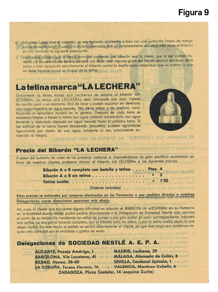 En el anterior artículo hablamos de la leche condensada la lechera. Parece normal que la propia empresa comercializara un biberón y diera instrucciones sobre cómo preparar adecuadamente su producto para administrarlo a los bebés (Figura 8). También comercializó una tetina adaptable a su biberón (Figura 9), en un claro intento de quedarse con buena parte del mercado de la alimentación infantil artificial y los productos necesarios para llevarla a cabo.