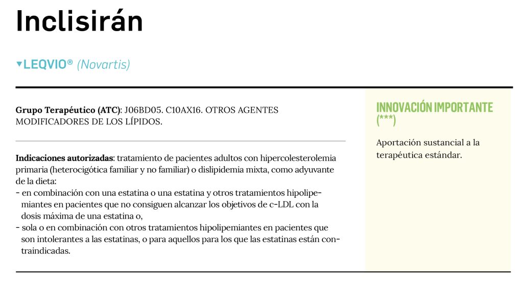 En definitiva, se trata del primer ARNpi dirigido a la PCSK9; aunque frente a esa diana ya se dispone de dos anticuerpos monoclonales con similares indicaciones, inicia una interesante vía en el tratamiento de la hipercolesterolemia y la aterosclerosis, profundizando en el gran potencial que tiene la terapéutica a base de ARN. Los datos de eficacia son indicativos de un importante efecto en la reducción del nivel de c-LDL, aunque la correlación de este efecto con la prevención del riesgo cardiovascular es todavía un elemento de incertidumbre. Por ahora, inclisirán se posiciona como una alternativa a otros –sobre todo, a evolocumab o alirocumab– en un régimen combinado con al menos una estatina en dosis altas, salvo contraindicación de ésta. Es decir, se limitará por ahora a una segunda línea de tratamiento, si bien su pauta –inyecciones subcutáneas cada 6 meses en fase de mantenimiento– puede beneficiar en gran medida el cumplimiento terapéutico.