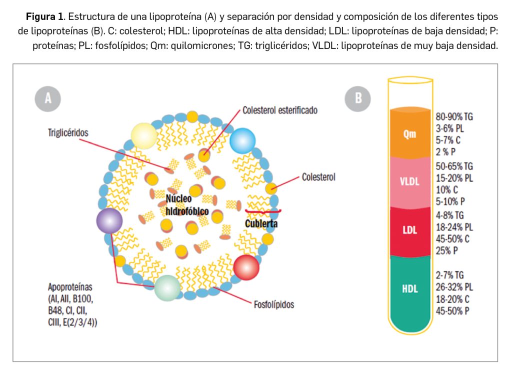Los lípidos son sustancias que nuestro organismo emplea como almacén de energía y que desempeñan importantes funciones (formación de membranas celulares, modificación de proteínas, producción de hormonas, etc.). Por su carácter liposoluble precisan para su transporte –en el medio acuoso que constituye el plasma– de un vehículo adecuado: colesterol, triglicéridos y fosfolípidos se transportan en el plasma formando macrocomplejos en los que las moléculas más hidrófobas se disponen en el centro y se recubren de otras hidrófilas, como fosfolípidos y apolipoproteínas. Estos complejos son lo que conocemos como lipoproteínas (Figura 1), entre las que se diferencian varios tipos en función de la composición del núcleo lipófilo y del tipo de apoproteínas que presentan (algunas constituyen la tarjeta de presentación a su receptor). Los niveles plasmáticos de lipoproteínas reflejan, por tanto, los de los lípidos que contienen.