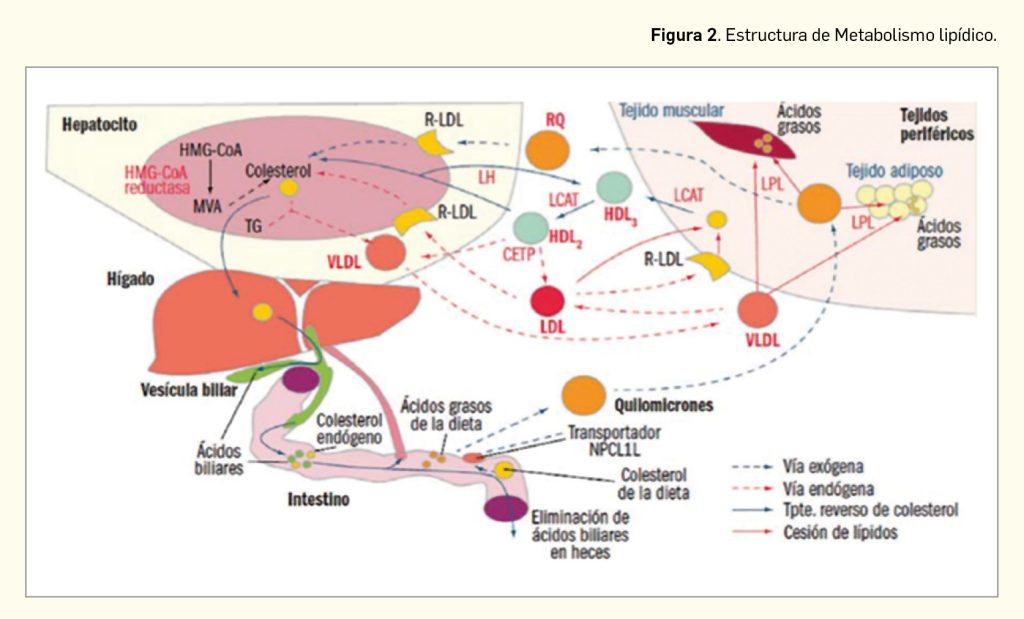 El colesterol hepático, endógeno o exógeno, puede ser esterificado y almacenado, excretarse en la bilis como colesterol libre o ser transformado en ácidos biliares, constituir nuevas lipoproteínas o incorporarse a las membranas plasmáticas de los hepatocitos. Aproximadamente el 80% del colesterol endógeno procede de síntesis hepática y se libera a la circulación en forma de VLDL; en los capilares del músculo esquelético y del tejido graso, las VLDL sufren el ataque de la LPL, que hidroliza los triglicéridos y libera ácidos grasos, que son captados por los tejidos y convierten a las VLDL en LDL. Los niveles elevados de LDL y su oxidación forman parte de la base etiopatogénica de la aterosclerosis. Las LDL circulantes son reconocidas por receptores presentes en las membranas celulares (R-LDL), produciéndose su endocitosis al interior celular, donde se convierten en sustrato de enzimas lisosomales, cediendo colesterol libre.