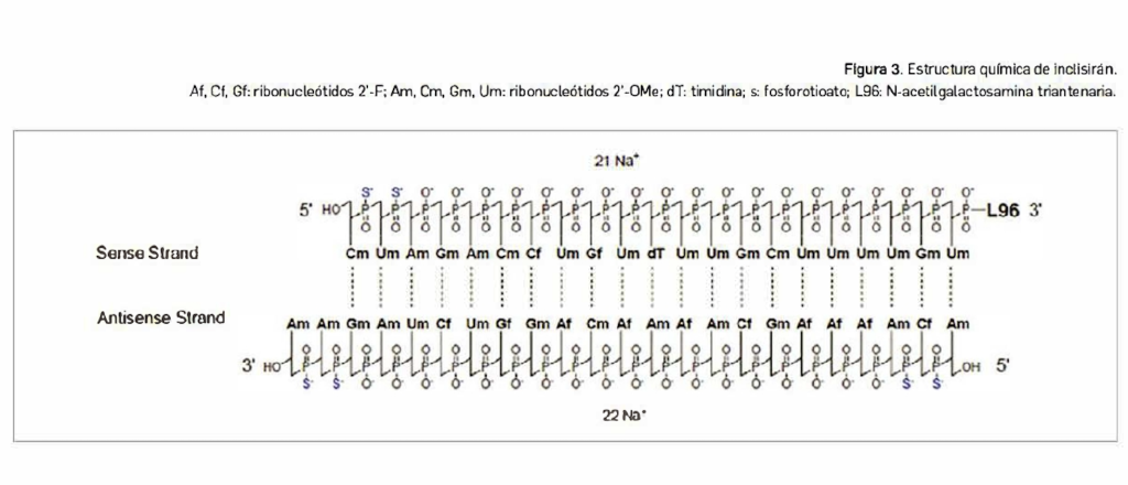 Inclisirán (Figura 3) es un nuevo ARN pequeño de interferencia (ARNpi) compuesto por una hebra sentido de 21 nucleótidos y una hebra antisentido de 23 nucleótidos. En el extremo 3’ de la cadena sentido se encuentra unida de manera covalente una molécula de N-acetilgalactosamina triantenaria que facilita su captación por los hepatocitos.