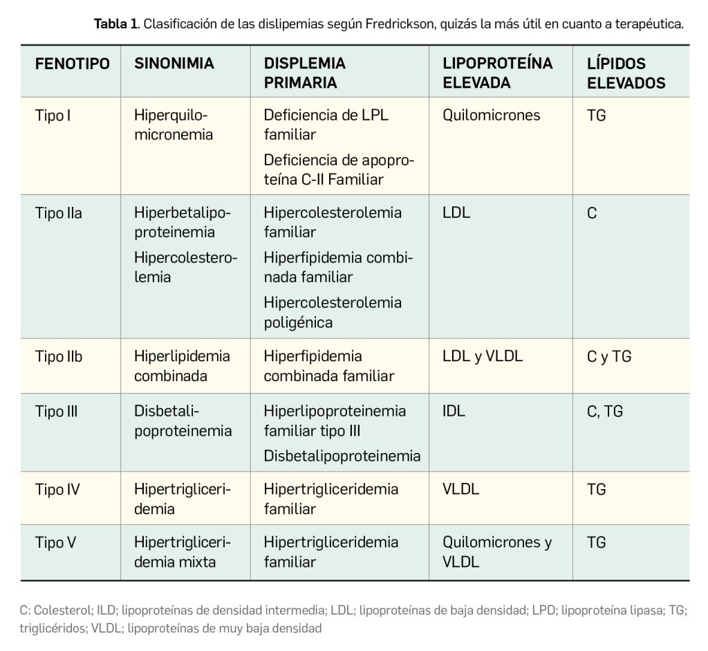 Las dislipemias han sido objeto de distintas clasificaciones (Tabla 1), pero se sabe que en cada uno de los tipos se pueden encontrar distintas enfermedades (primarias o secundarias a otras patologías) que pueden dar lugar a la alteración de los niveles de un tipo de lipoproteína. La reducción del nivel del colesterol unido a LDL (en adelante, c-LDL) y los triglicéridos retrasa la progresión e incluso puede reducir la placa de ateroma. Todos los datos disponibles indican que el control de las dislipemias es esencial en la prevención primaria y secundaria de las enfermedades cardiovasculares.