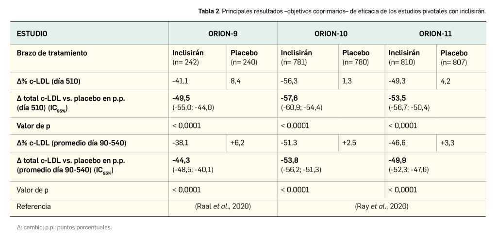 De acuerdo a los resultados publicados de los tres estudios, en todos ellos el tratamiento con inclisirán se asoció con una reducción estadísticamente significativa de los niveles de c-LDL en comparación con la administración de placebo (Tabla 2).