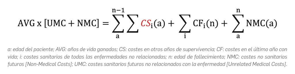 Si bien el aumento de la supervivencia de los pacientes es un resultado fundamental de cualquier intervención sanitaria, en el contexto de los análisis coste-efectividad (ACE), el hecho de prolongar la vida de los pacientes genera el potencial consumo de recursos sanitarios y otros bienes y servicios que deberían ser considerados. Los costes de este consumo en los años de vida ganados (AVG) se denominan costes futuros y su inclusión en los ACE podría tener un fuerte impacto en sus resultados, incluso pudiendo alterar las decisiones de adopción de nuevas tecnologías sanitarias. Los costes totales futuros representan la suma de los costes sanitarios futuros, divididos en costes relacionados y no relacionados con la enfermedad, y los costes no sanitarios futuros. Comúnmente, los únicos costes considerados en los modelos económicos son los costes sanitarios futuros relacionados con la enfermedad y las ganancias en productividad derivadas de vivir más tiempo (si se adopta la perspectiva de la sociedad).
