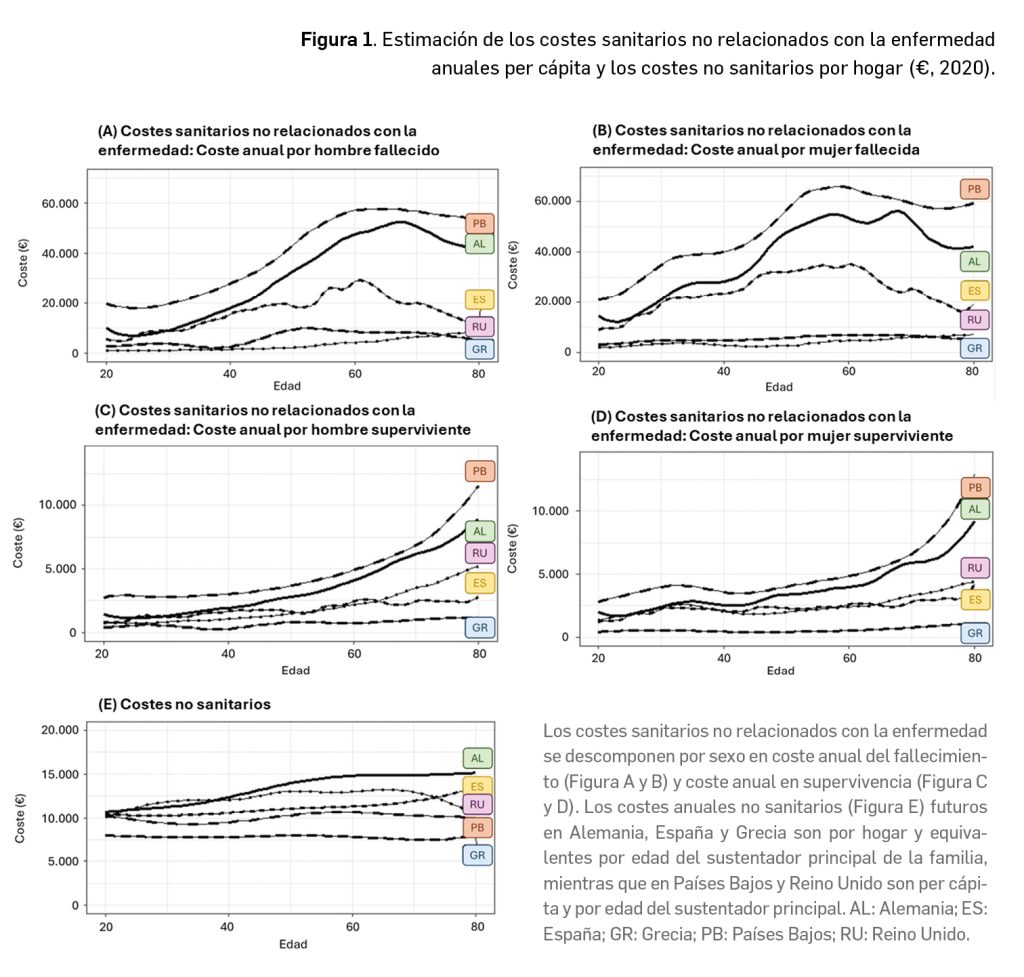 Los resultados mostraron que los costes sanitarios futuros no relacionados con la enfermedad asociados a las intervenciones que prolongan la vida (representados en la Figura 1 A, B, C y D) son significativamente más altos que los costes no sanitarios (representados en la Figura 1 E) en todos los países analizados. El coste promedio no sanitario por hogar en Alemania, España y Grecia se situó alrededor de los 13 300€, 11 100€ y 7800€, respectivamente. En el caso de los Países Bajos y Reino Unido, el coste promedio no sanitario por edad se situó en torno a los 10 000€ y 12 200€, respectivamente.