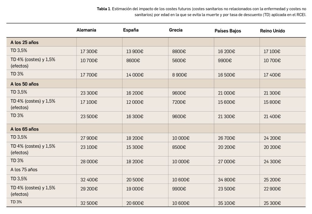 Mokri y colaboradores han proporcionado estimaciones estandarizadas de los costes sanitarios futuros no relacionados con la enfermedad y los costes no sanitarios futuros, observándose un impacto parcial en el RCEI de hasta 35 000€ por AVAC ganado. Si bien el impacto en cada país es relativamente alto en relación con los umbrales de disponibilidad a pagar comúnmente empleados, la variación en magnitud entre países es considerable. Las diferencias existentes en la financiación de los sistemas sanitarios podrían explicar en parte la variación en los costes sanitarios futuros no relacionados con la enfermedad, especialmente entre Grecia y el resto de los países.
